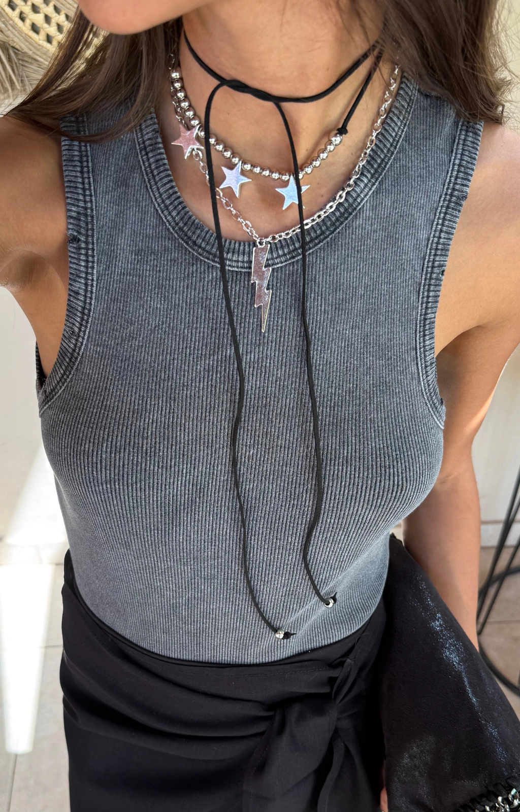 Collar de cadena, color níquel. Dije con forma de rayo en el centro y gancho que te permite regular el largo.