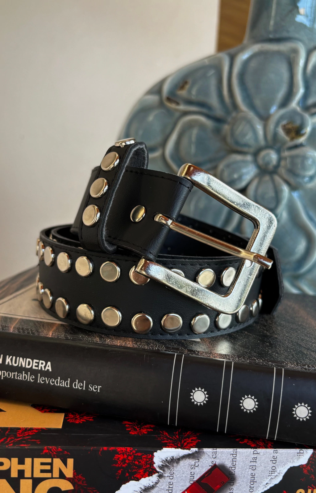 Cinturón de eco cuero, color negro. Hebilla rectangular, en color níquel. Tachas a lo largo de todo el cinto, en la parte inferior y superior. Tira pasa cintos, con tachas a tono. Tu mejor aliado para darle onda a cualquier outfit ♥