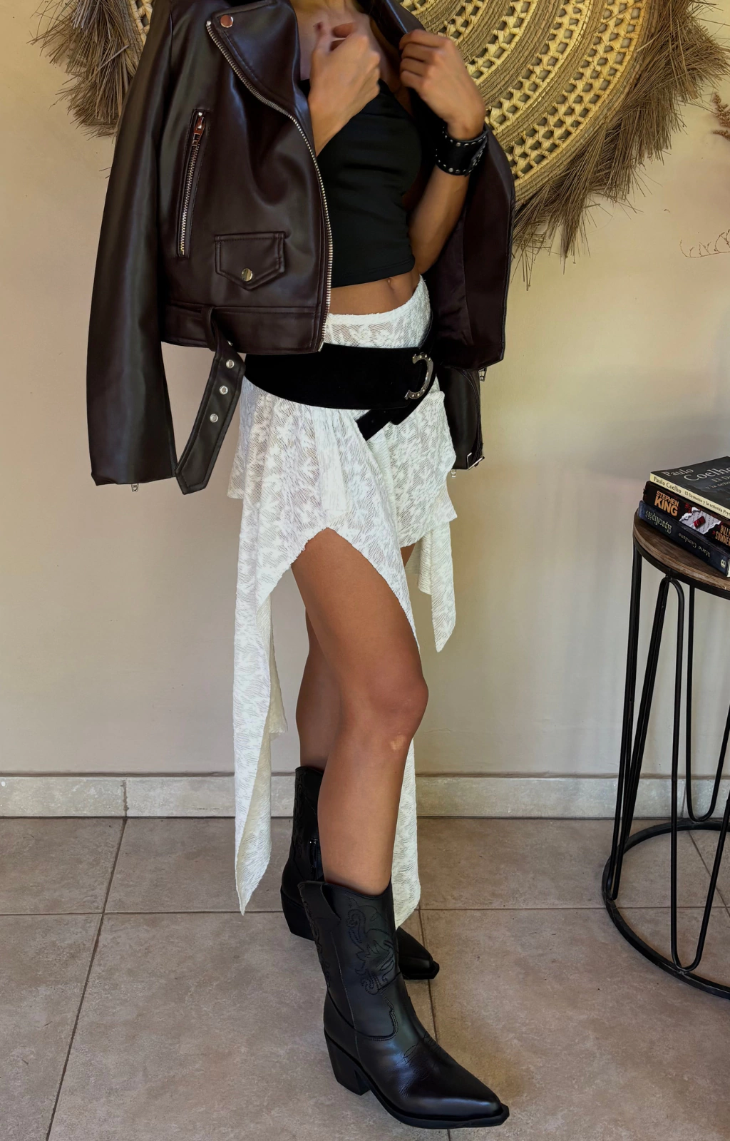 Falda de encaje elastizado, con motivo floral. Tiro alto. Diseño asimétrico que combina mini al frente, caída larga en un lateral, y frunce con caída más corta en el otro, aportando movimiento y un toque súper canchero.
