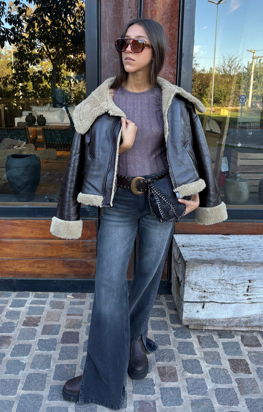 Pantalón flare, en denim elastizado color negro, con detalle de matizado y gastado. Tiro medio. Tiene tajos en el lateral de la botamanga, y detalle desflecado en el ruedo. Acceso mediante cierre y botón metálico. Avíos color níquel.