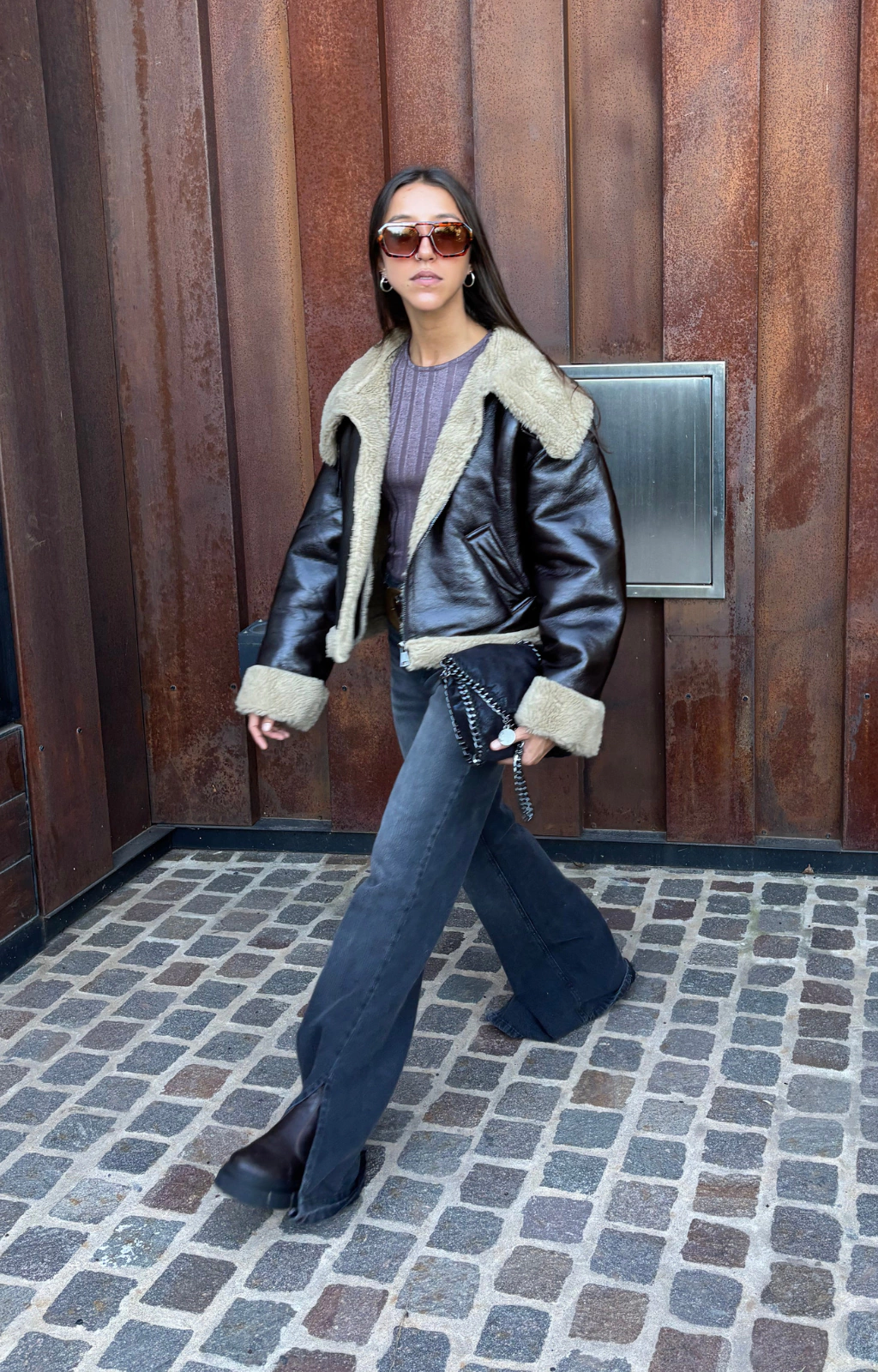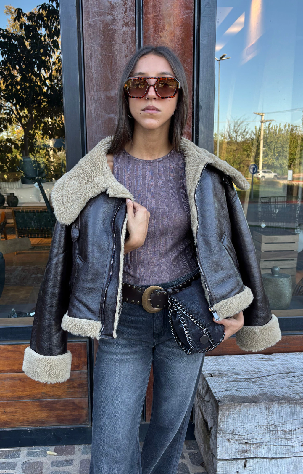 Gamulan de eco cuero, color chocolate vintage. Forrería interna en corderito beige. Acceso mediante cierre frontal, terminación en tira y hebilla para cerrar cuello alto. Bolsillos laterales en el frente. Avíos color bronce. Calce oversize.